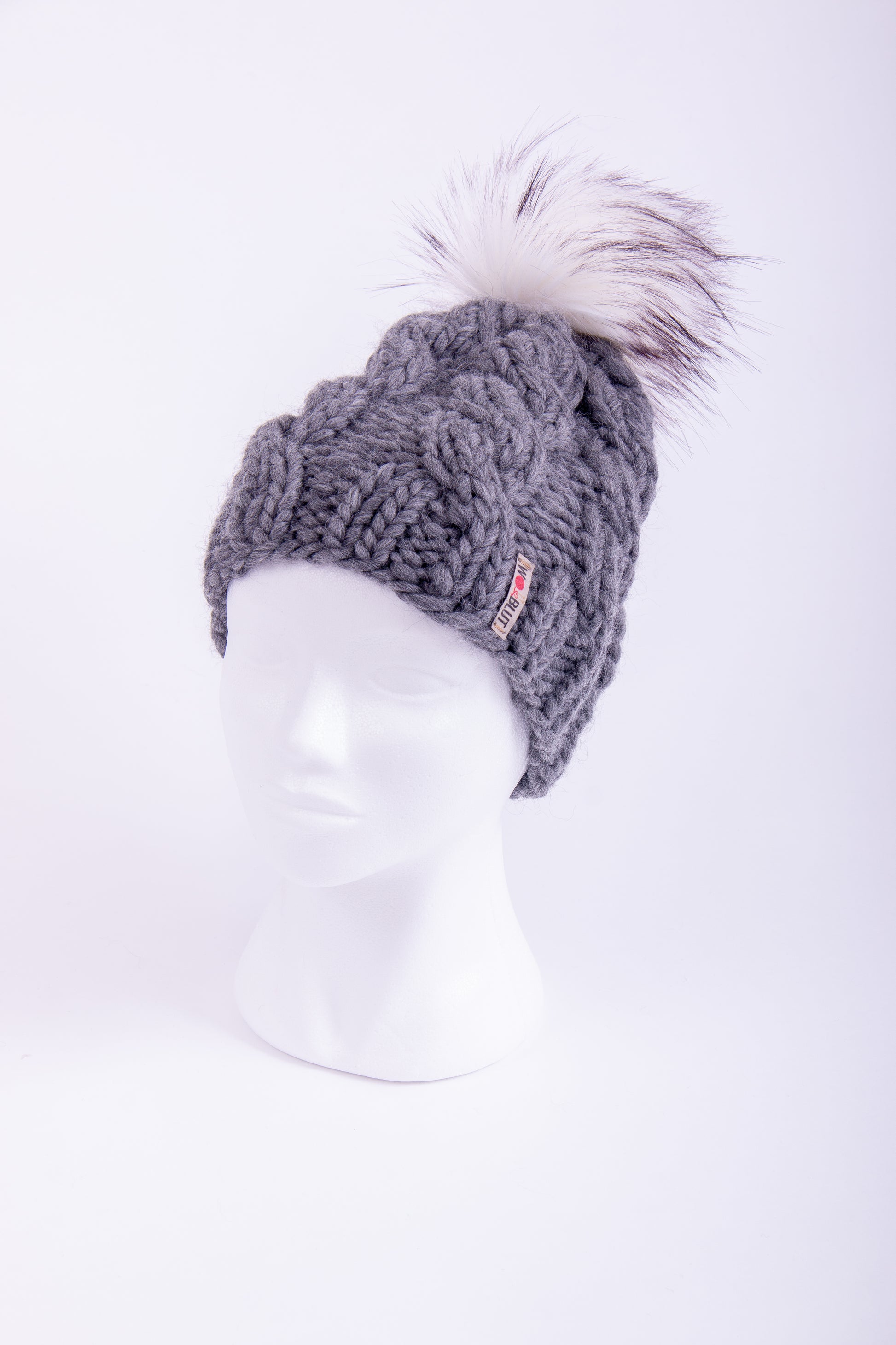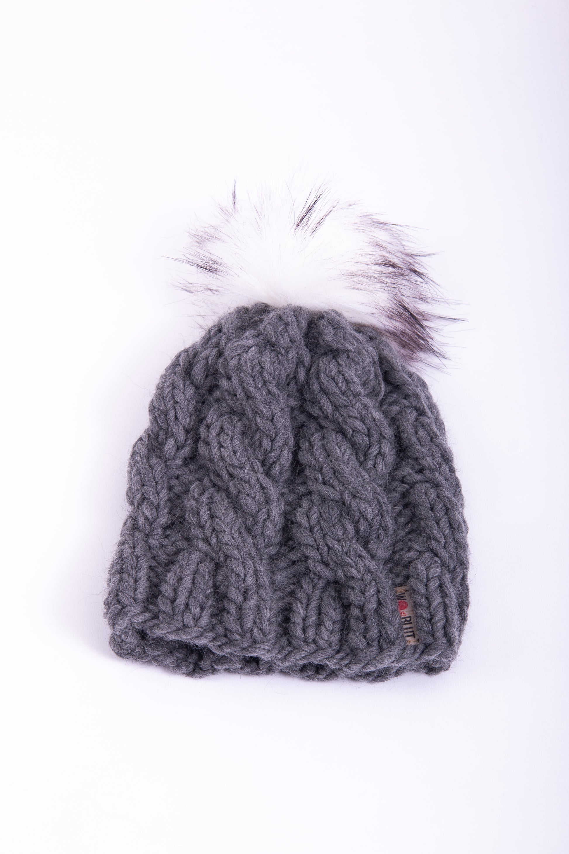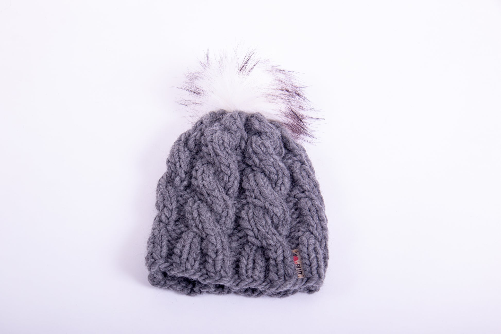 Handgestrickte Beanie aus 100% peruanischer Schurwolle mit Zopfmuster und hangemachtem abnehmbaren Kunstfell-Pompom.