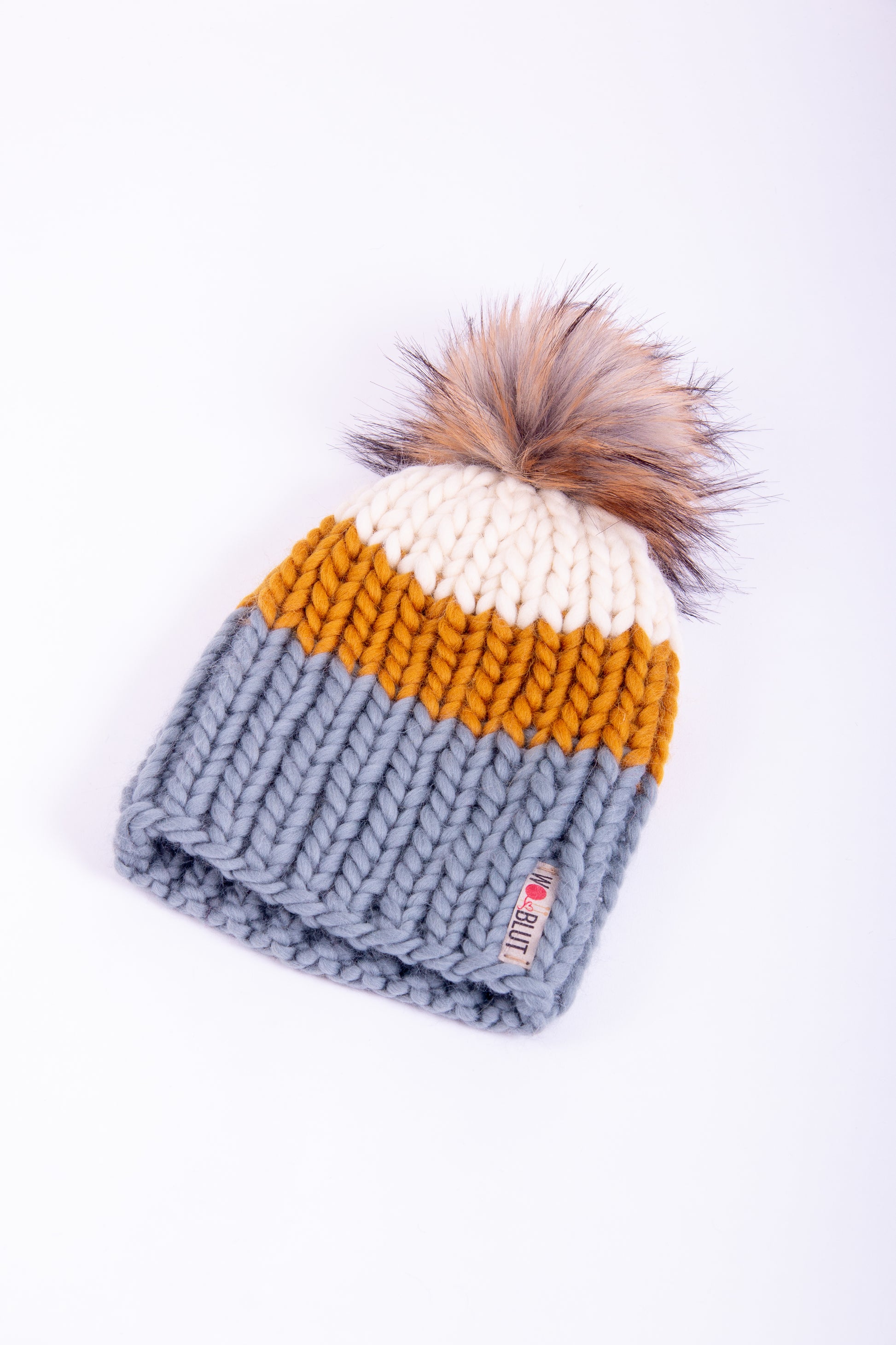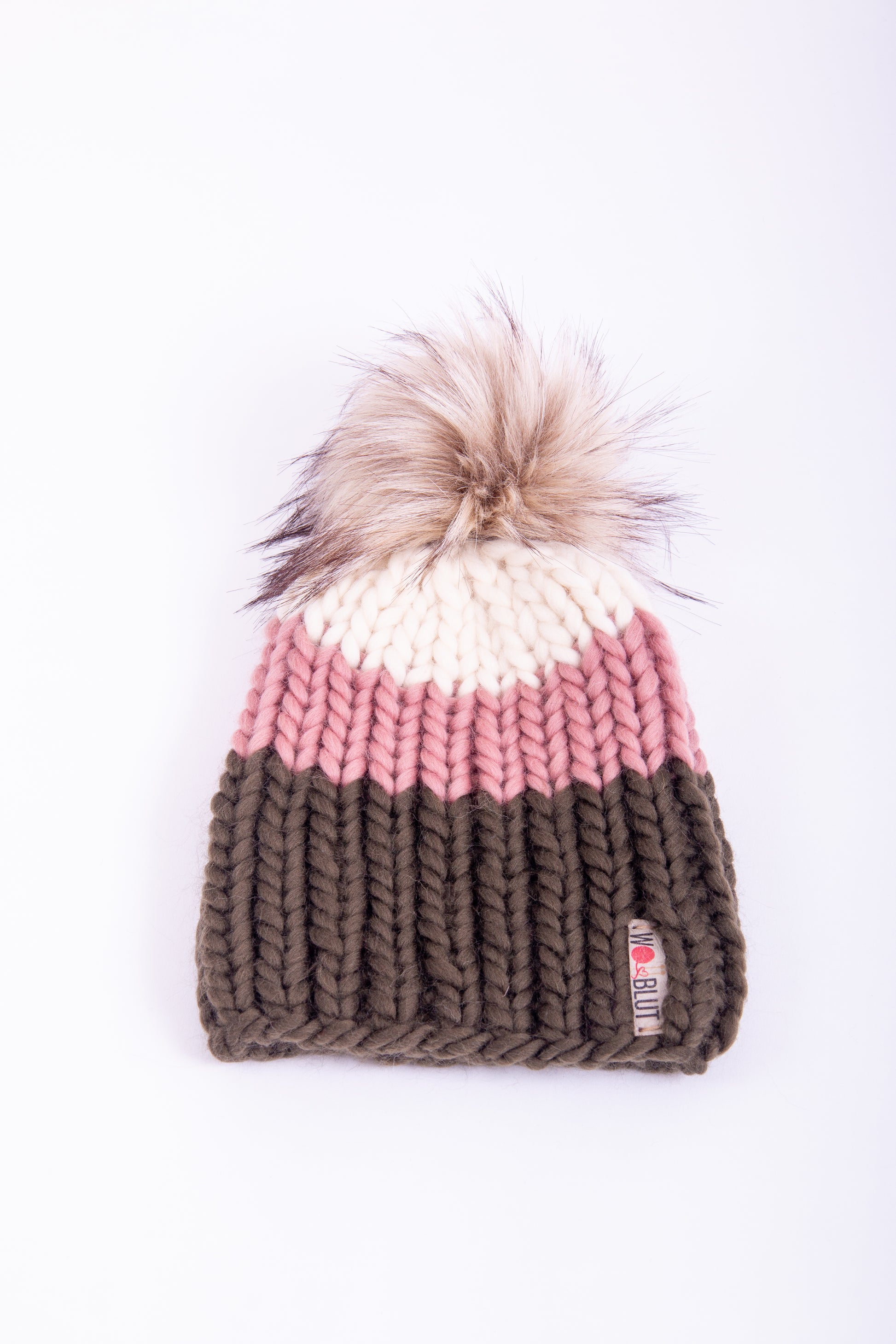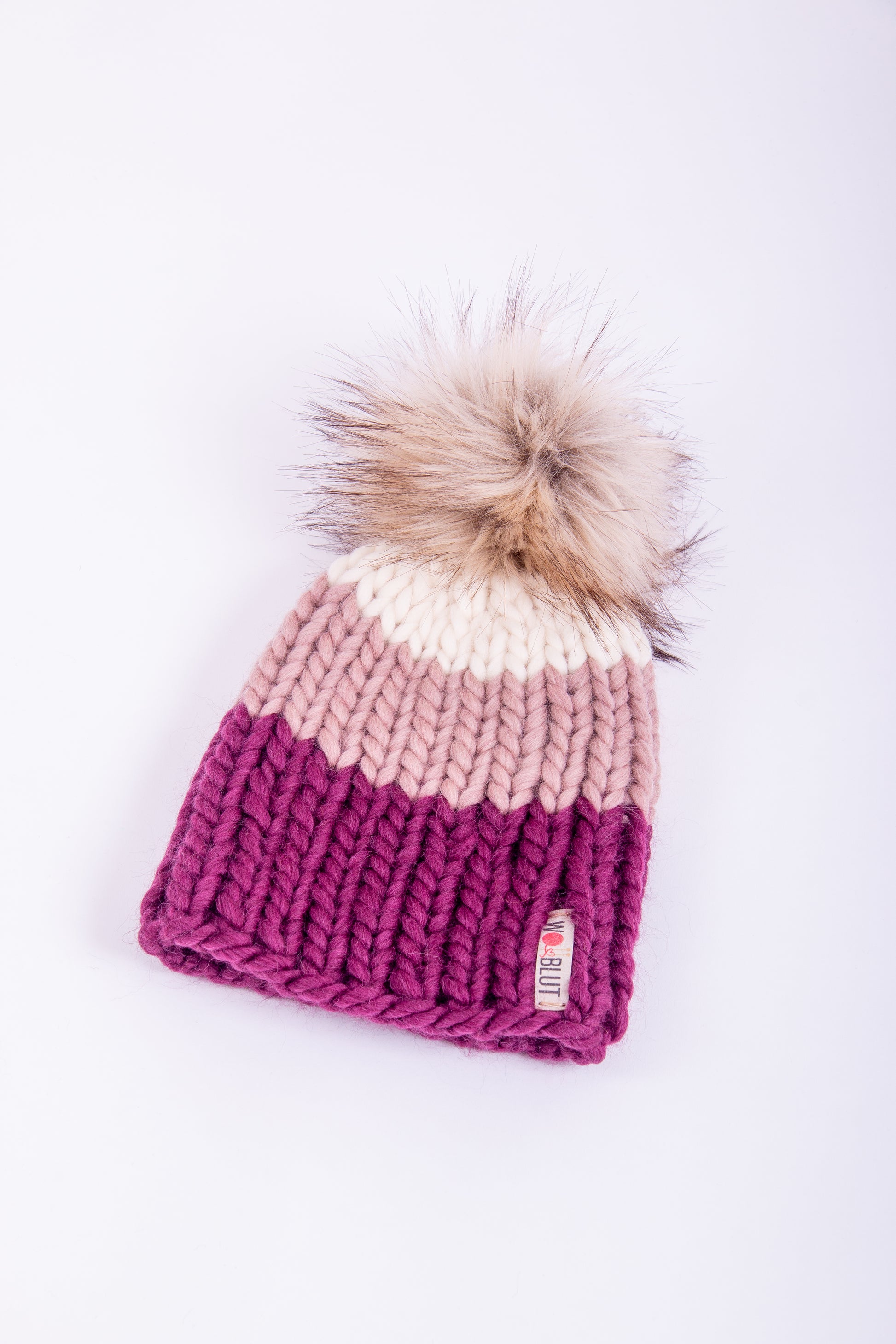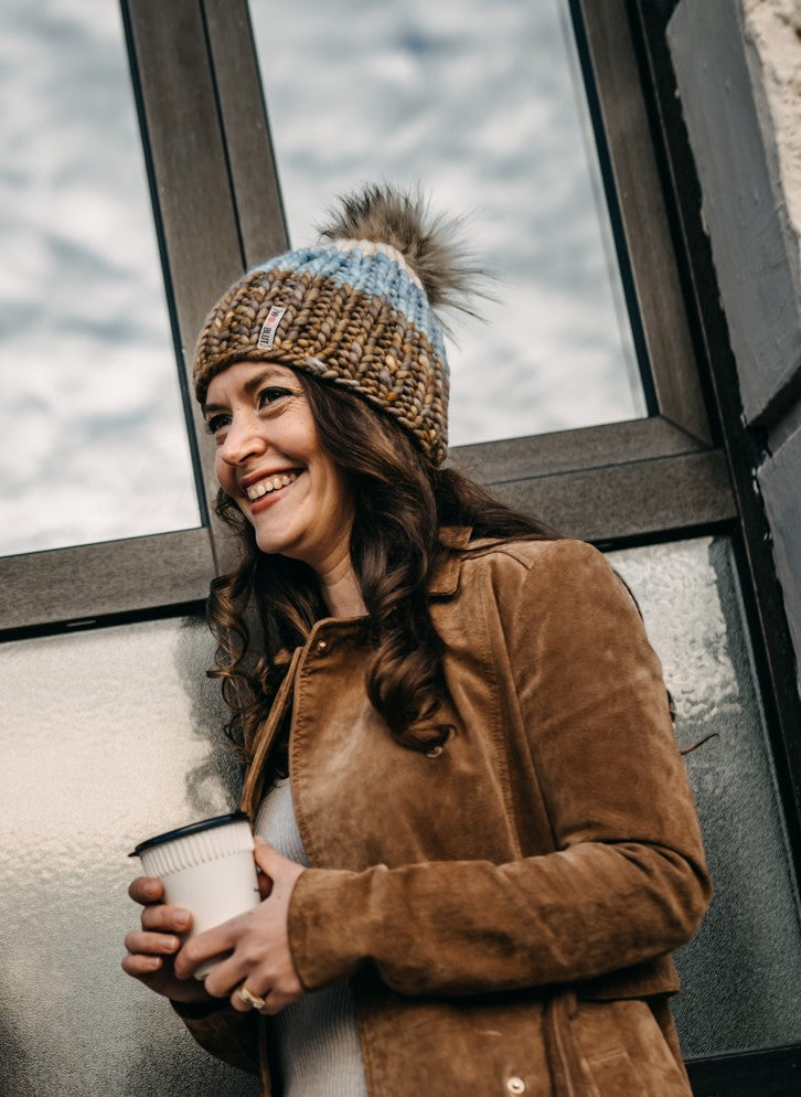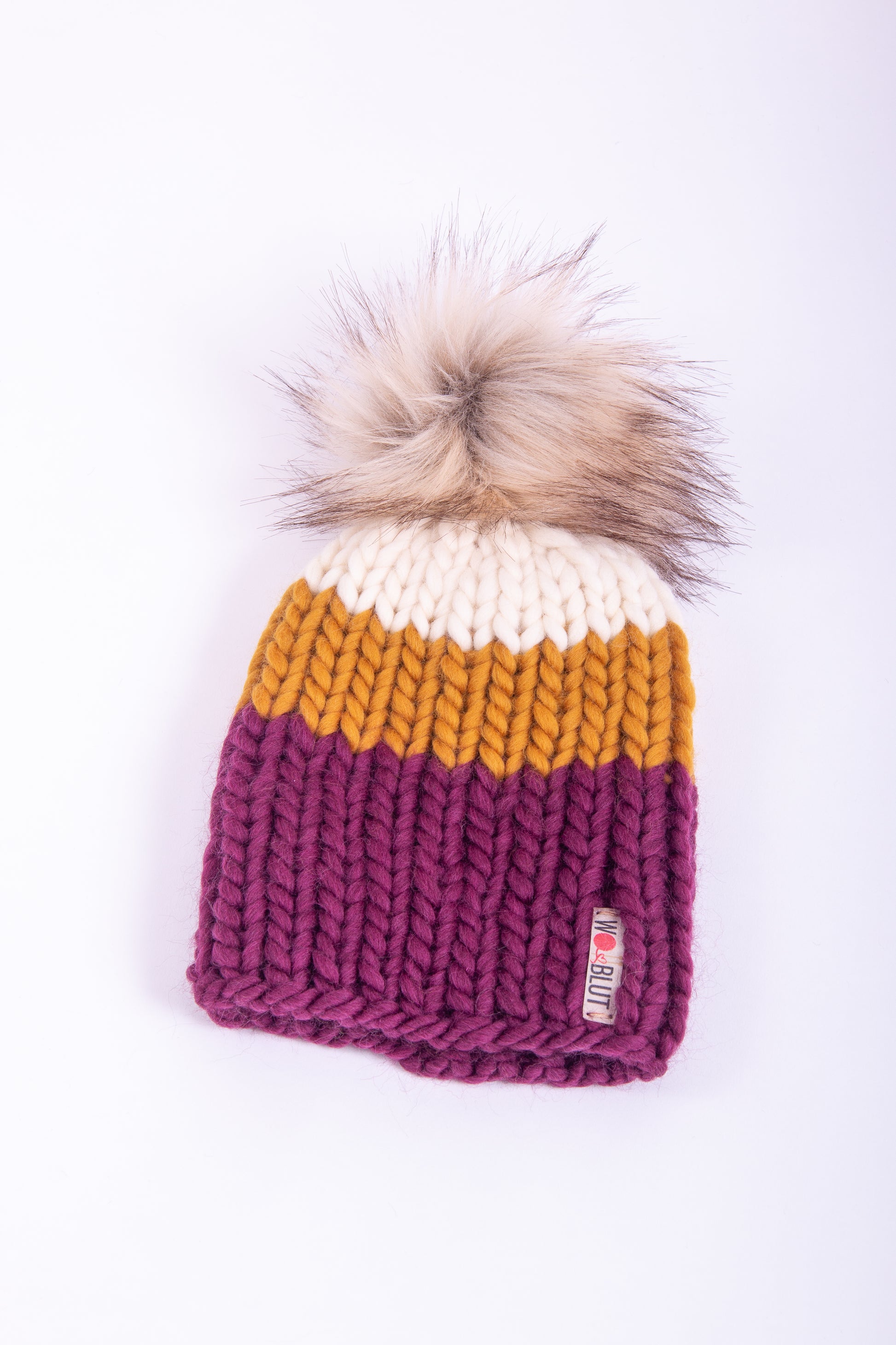 Handgestrickte Beanie aus 100% peruanischer Schurwolle mit handgemachtem, abnehmbaren Kunstfell-Pompom.