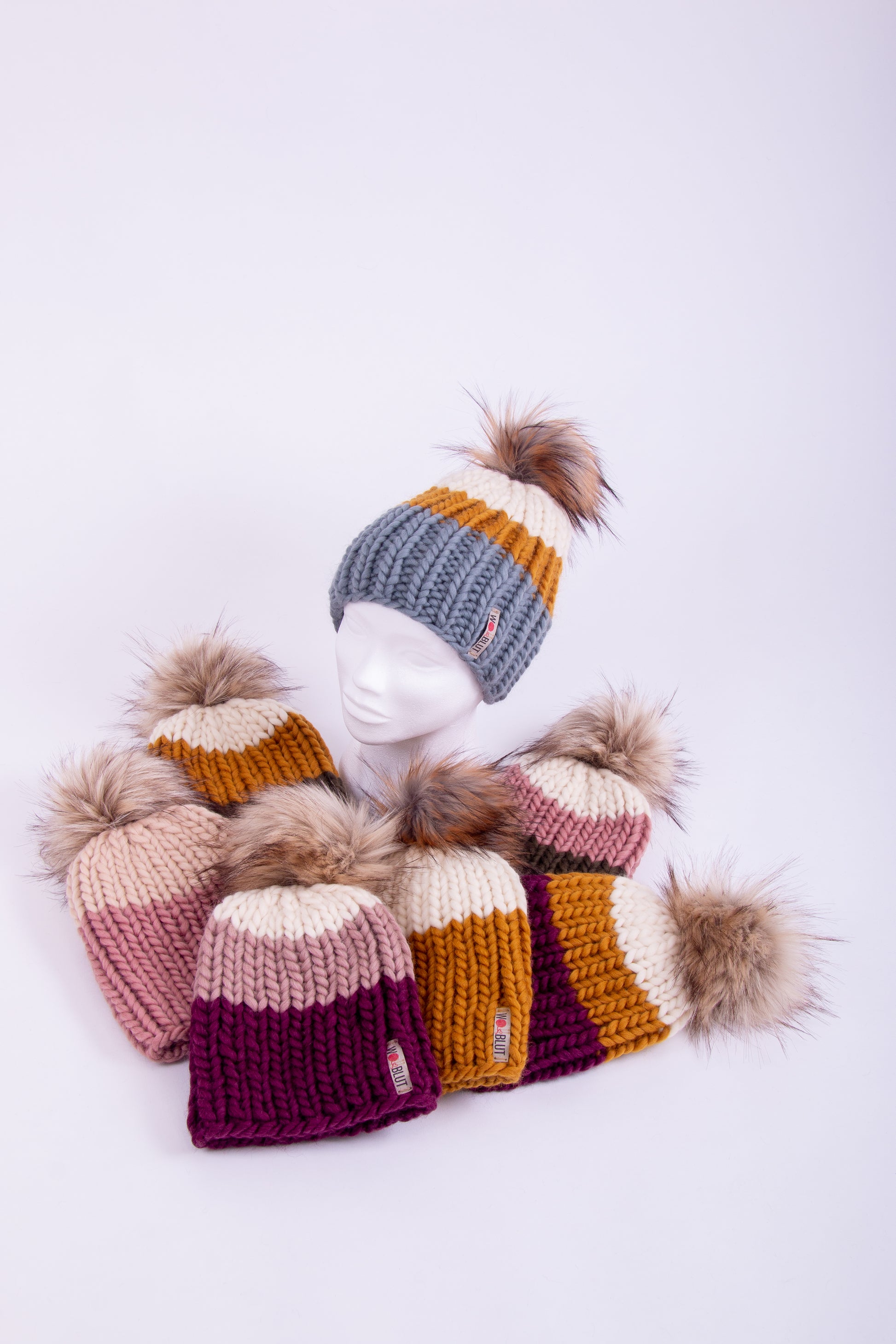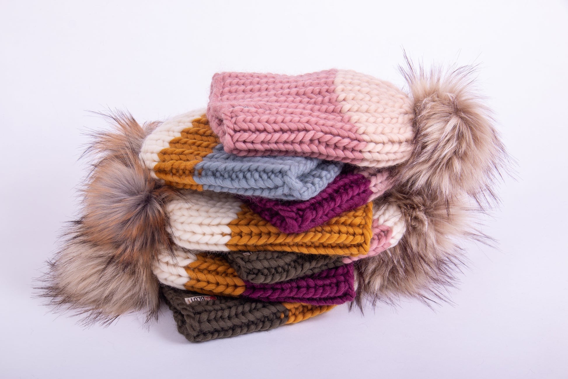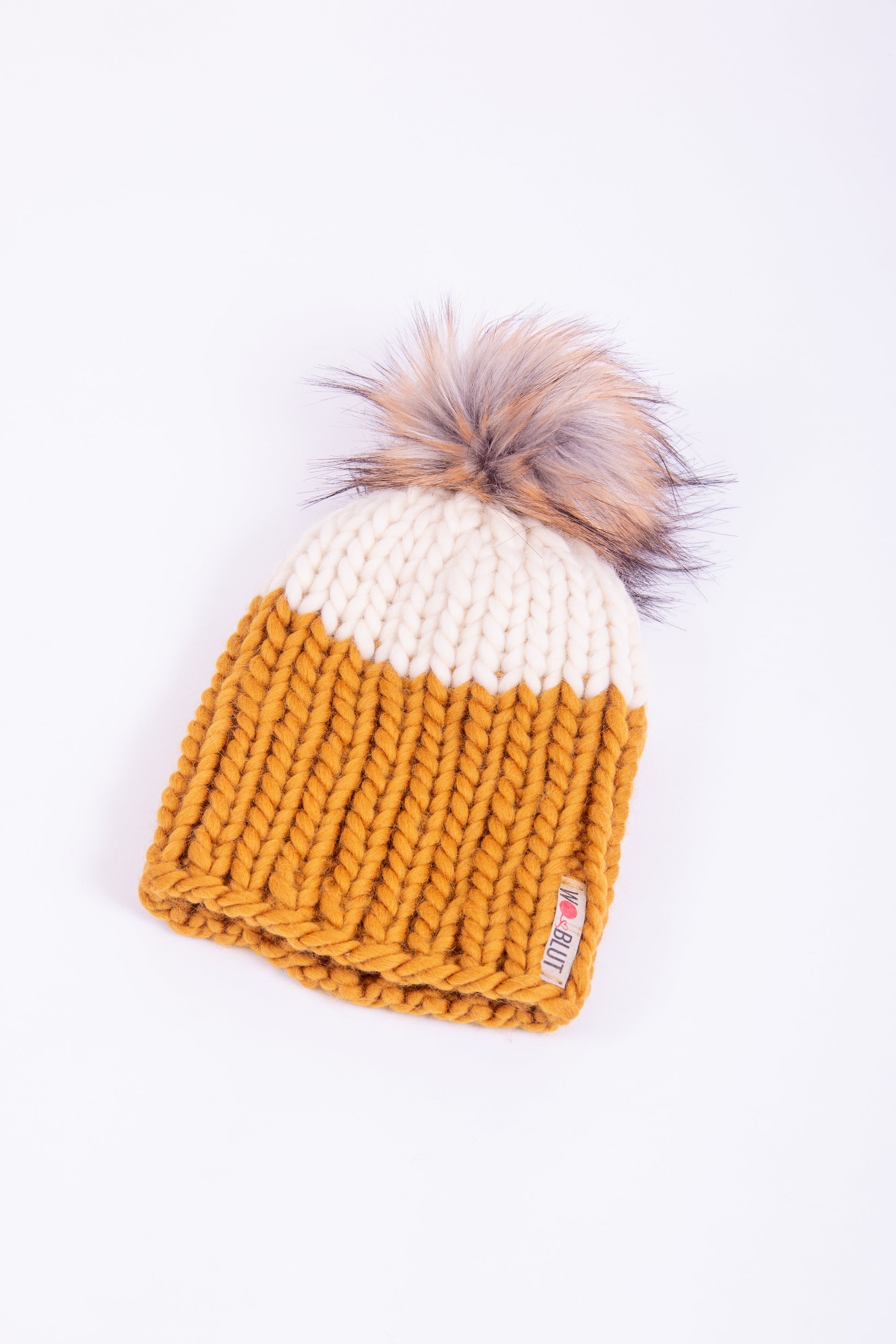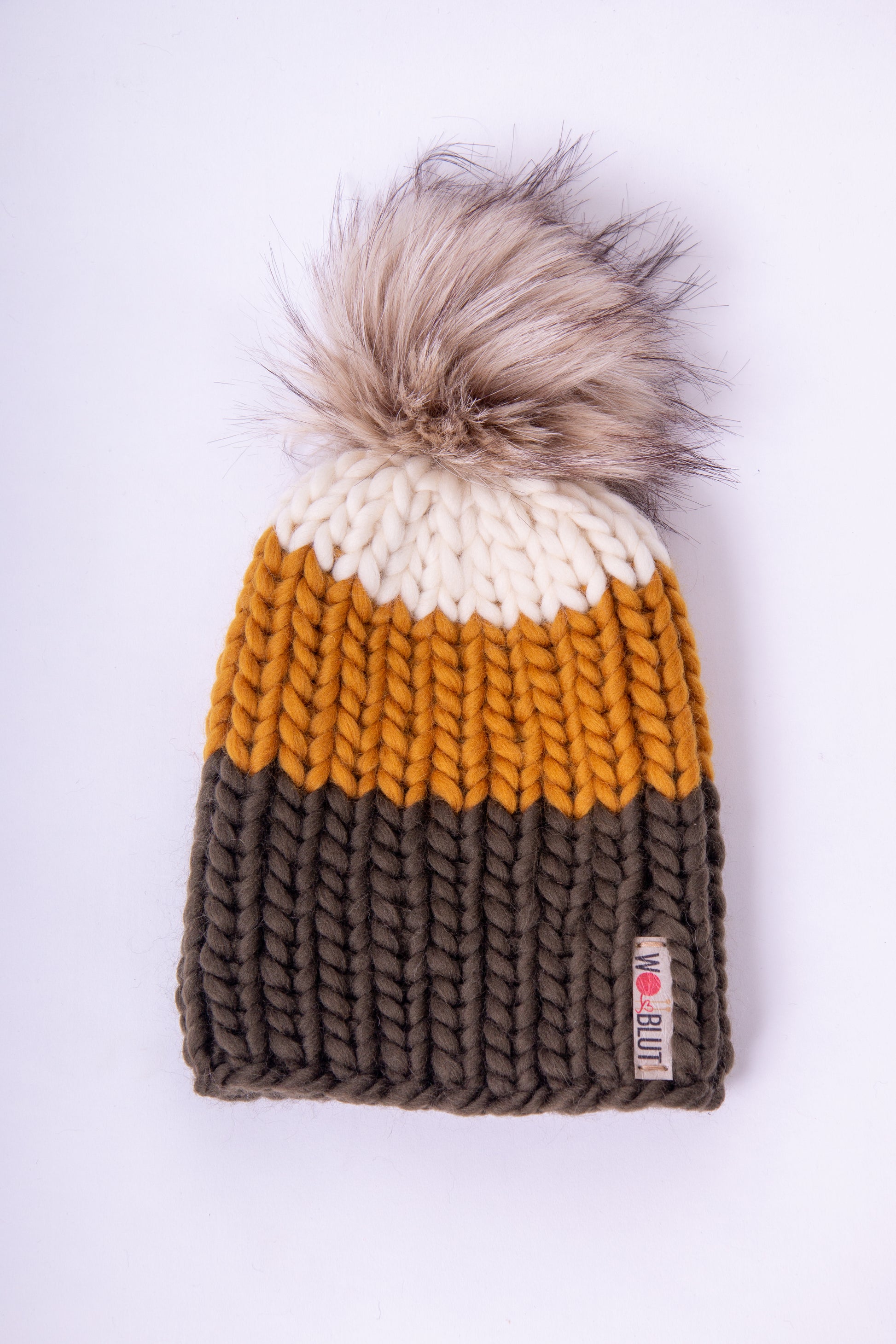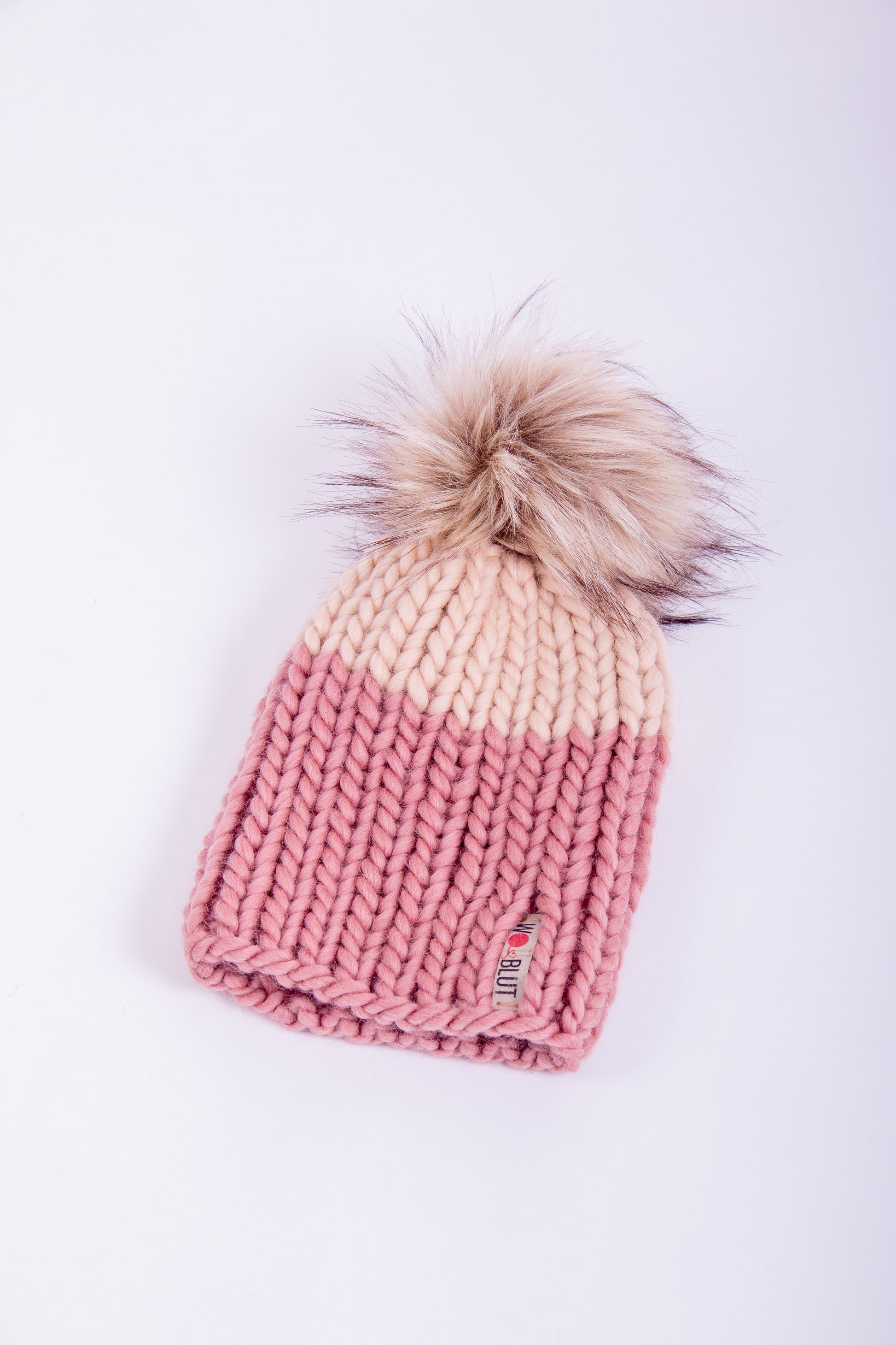Handgestrickte Beanie aus 100% peruanischer Schurwolle mit handgemachtem, abnehmbaren Kunstfell-Pompom.