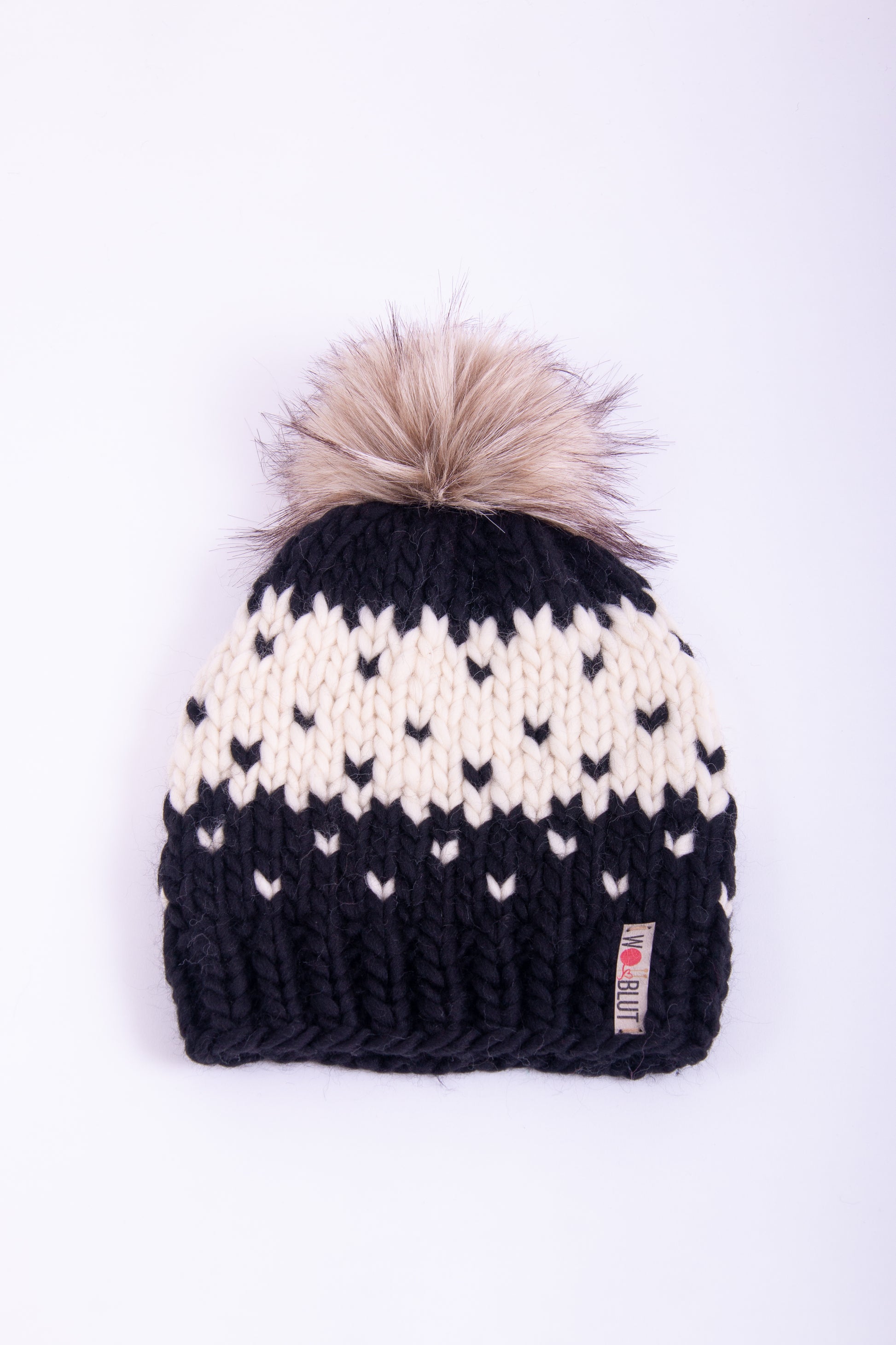 Handgestrickte, mehrfarbige Beanie aus 100% peruanischer Wolle mit handgemachtem, abnehmbaren Kunstfell-Pompom.
